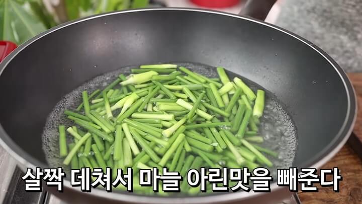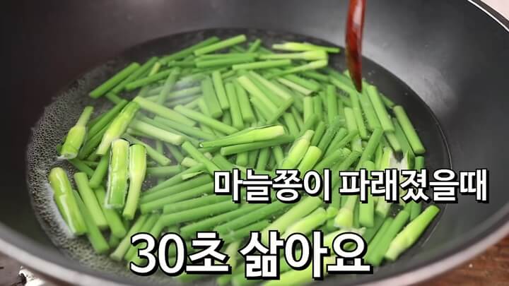 냄비 가장자리가 보글보글 끓어오르고 마늘쫑 색도 진해지면 건져냅니다. 한 30초 정도만 삶아주면 돼요.