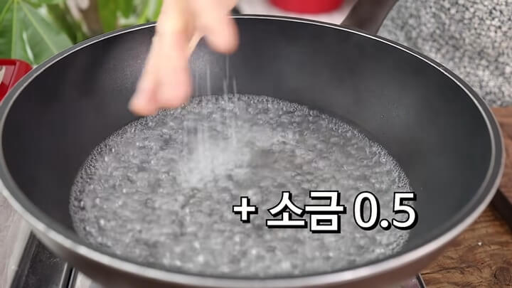 냄비에 물이 끓으면 소금 반 숟갈 정도 넣어주고 마늘쫑을 넣어서 살짝 데쳐줍니다. 이렇게 살짝 데쳐주면 마늘쫑의 맵고 아릿한 맛을 제거할 수 있어요.