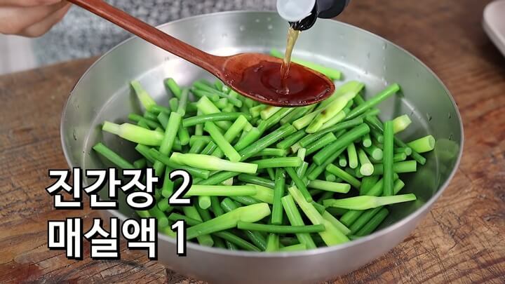 진간장 2 숟갈, 매실액 1 숟갈을 넣고, 생강청을 0.5숟갈 넣어줍니다. 마늘쫑이라 마늘은 넣지 않고, 생강청을 조금 넣어주면 산뜻한 맛이 나서 더욱 맛있어요. 생강 갈아서 넣어도 되고, 없으면 생략해도 좋아요.