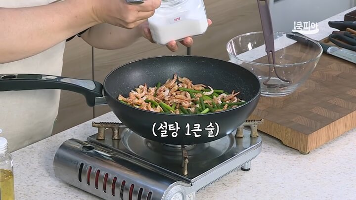 수분이 졸아들었으면 건새우를 넣은 후 잠시 불을 끕니다. 불을 끈 상태에서 양념 재료를 하나씩 넣어주어요.