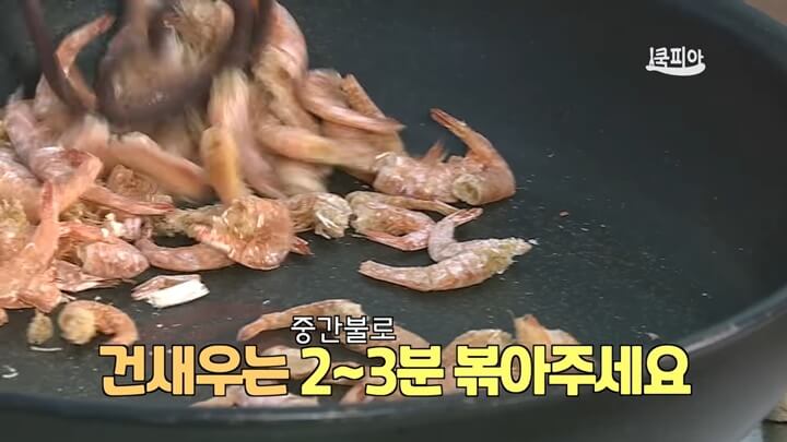 그리고 건새우는 마른 팬에 한번 볶아서 사용하도록 해요. 보통 건새우나 건어물은 냉동실에 보관하게 되는데, 건어물의 특성상 냉동보관 시 냉장고 속 다른 냄새를 다 빨아들이기 때문에 냉동실에서 꺼낸 것을 그대로 사용할 경우 냉장고 냄새가 그대로 배어있는 경우가 많아요. 그러니 새우, 멸치 등 건어물은 한번 볶아서 사용하는 게 좋아요.