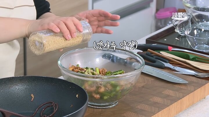 그리고 볼에다 마늘쫑건새우볶음을 모두 붓고 통깨를 솔솔 뿌려주고, 깻가루도 약간 뿌려줍니다. 마늘쫑새우볶음을 볶은 후 바로 다른 그릇에 옮겨서 열기를 식혀주는 것이 좋아요. 만약 열기가 있는 프라이팬에 그대로 두고 식히면 잔열에 의해 마늘쫑이 계속 익기 때문에 누렇게 변하게 돼요.
