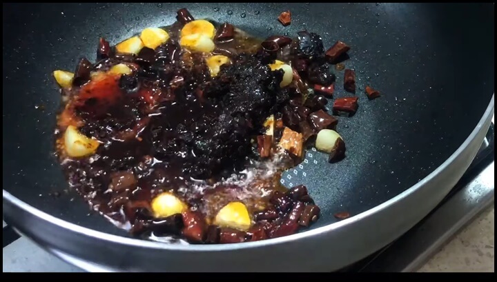 3) 어느 정도 향이 올라오면 마라소스를 넣고 볶아줍니다. (혹시 산초열매를 추가하려면 지금 넣고 볶아줍니다.)