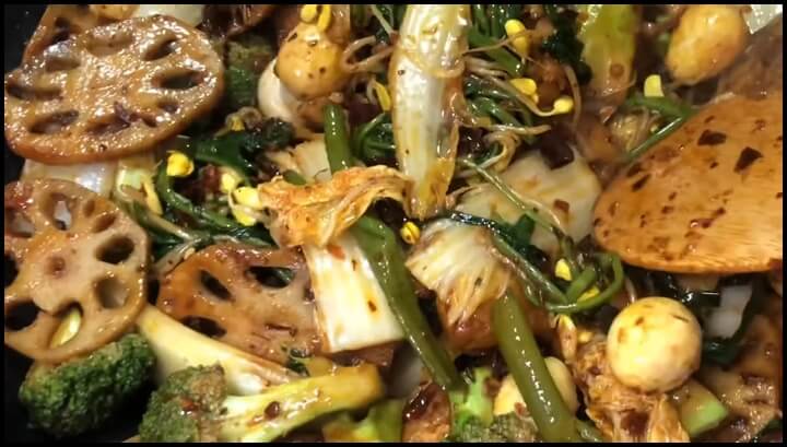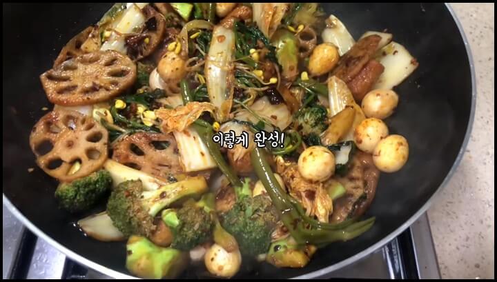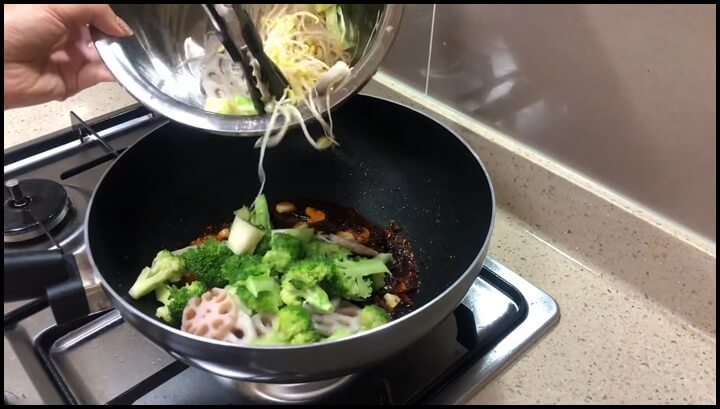 5) 단단한 채소, 연근, 브로콜리, 콩나물 등을 넣고 골고루 잘 볶아줍니다.