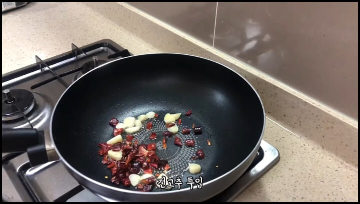 2) 마늘을 살짝 볶은 후 잘게 자른 건고추를 넣고 같이 볶아줍니다.