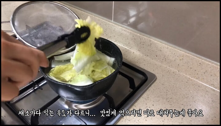 4) 배추도 데쳐냅니다. 각각의 채소마다 익는 속도가 다르니 채소별로 따로 데쳐주는 것이 좋습니다.