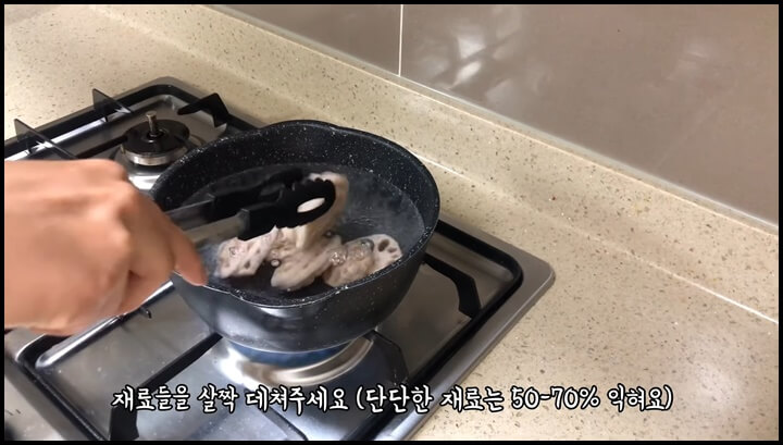 1) 끓는 물에 연근을 넣고 50~70% 정도 익혀서 건져냅니다.