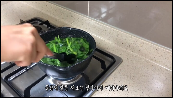 5) 공심채도 데쳐내는데, 공심채 같은 부드러운 채소는 넣자마자 건져내야 합니다.