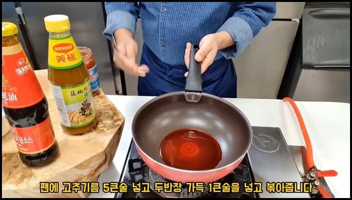1) 먼저 팬에 고추기름 5큰술을 넣고, 두반장을 가득 1큰술 넣어서 살짝 볶아줍니다.