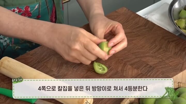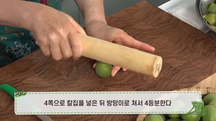 매실의 씨앗을 제거하는 방법은 먼저 매실의 홈을 따라 돌려가며 칼집을 내주고, 다른 면도 돌려가며 칼집을 내어 4쪽으로 칼집을 내어줍니다. 그런 다음 매실을 세워서 방망이로 내리치면 매실이 으깨지며 칼집을 따라 4쪽으로 분리가 돼요.