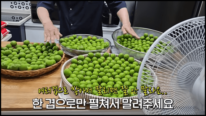 1) 잘 씻은 매실은 소쿠리에 한겹씩 가지런히 담아줍니다. 겹쳐 놓으면 잘 마르지 않으니 한 겹으로 잘 담아줍니다.