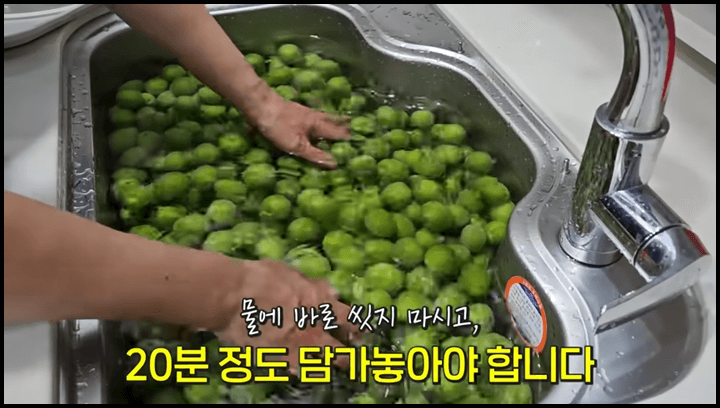 1) 매실은 물에 20분 정도 담가둡니다. 그래야 매실의 이물질이 빠지고, 잔류농약도 싸악 빠집니다. 굉장히 중요한 단계이니 꼭 20분 담가줍니다.