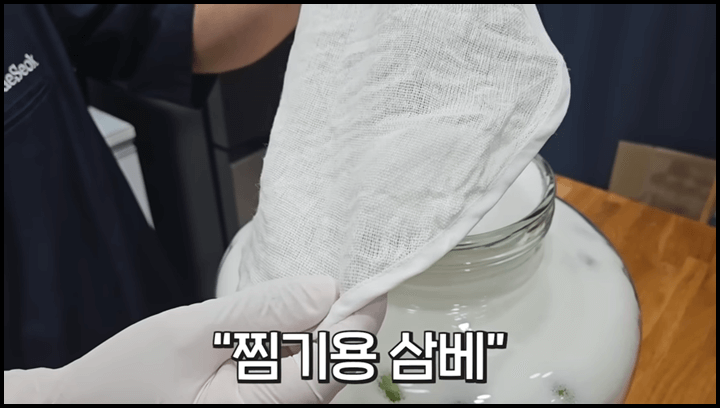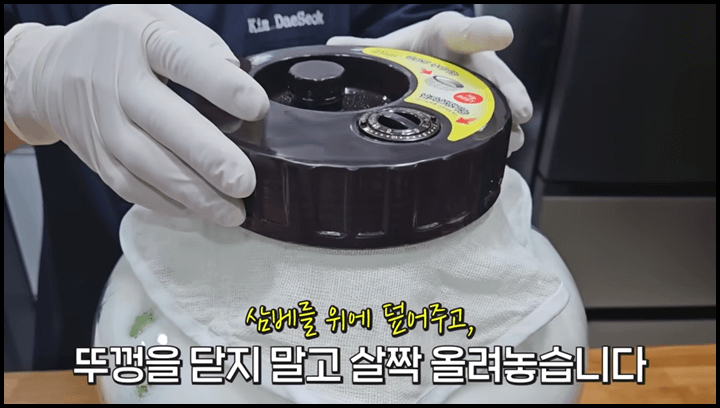 5) 삼베주머니로 입구를 덮어준 다음 뚜껑을 덮어줍니다.