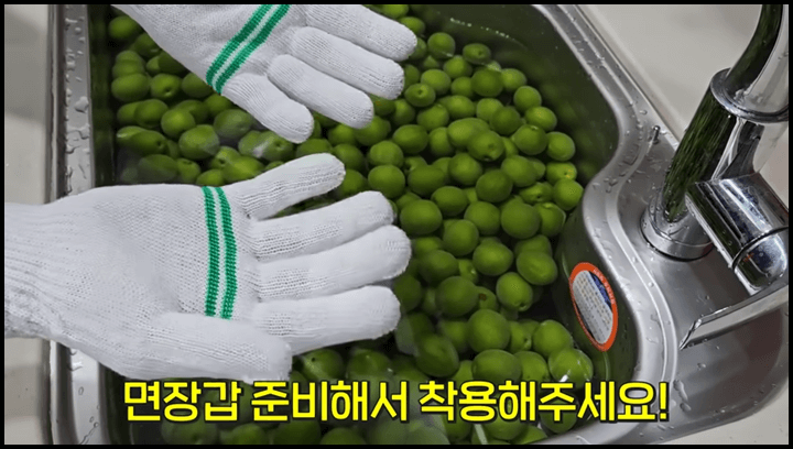 3) 면장갑 낀 손으로 매실을 돌려가며 매실의 잔털을 제거해 줍니다. 잔털이 있으면 세균이 번식할 수 있으니 깨끗이 제거해 줍니다.