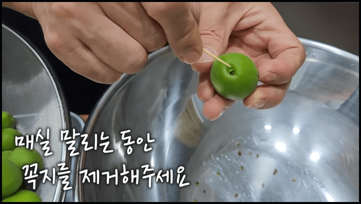 3) 물기를 말리는 동안 매실의 꼭지를 제거해줍니다. 매실의 꼭지는 떫은 맛이 나고 쓴맛도 나기 때문에 꼭 제거해 주는 것이 좋습니다. 그리고 꼭지를 제거하면 꼭지 주변 건조도 쉽습니다.