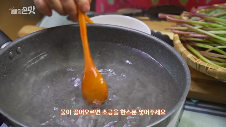 냄비에 물을 적당히 부어주고, 물이 끓어오르면 소금을 한 스푼 넣어주세요. 그리고 머위를 넣어 데치는데 줄기 부분을 먼저 넣어 주세요. 이파리 부분은 연해서 금방 삶아지니 줄기, 머위대 부분을 먼저 넣어 충분히 삶아지도록 합니다.