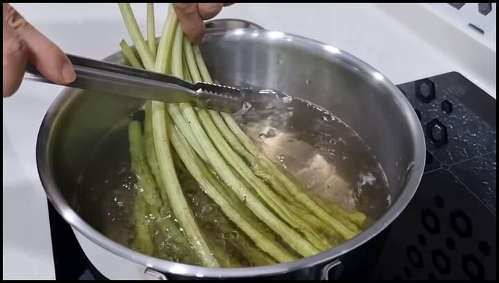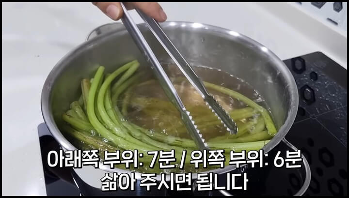 3) 머위대를 모두 푹 담가서 6분 정도 삶아줍니다. 총 삶아주는 시간은 굵은 줄기는 총 7분, 가는 줄기는 총 6분을 삶아 주게 됩니다.