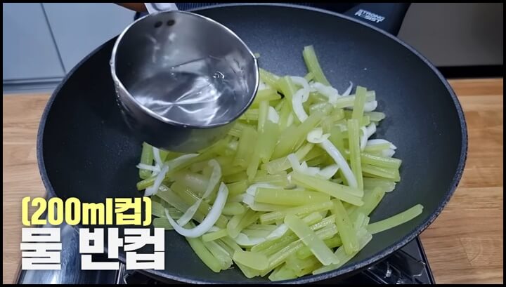 2) 2분 정도 볶은 후 여기에 물 반컵을 넣어 줍니다.