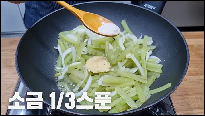 4) 소금 1/3 스푼을 넣고, 볶아줍니다. 불은 중불로 해서 볶아줍니다.