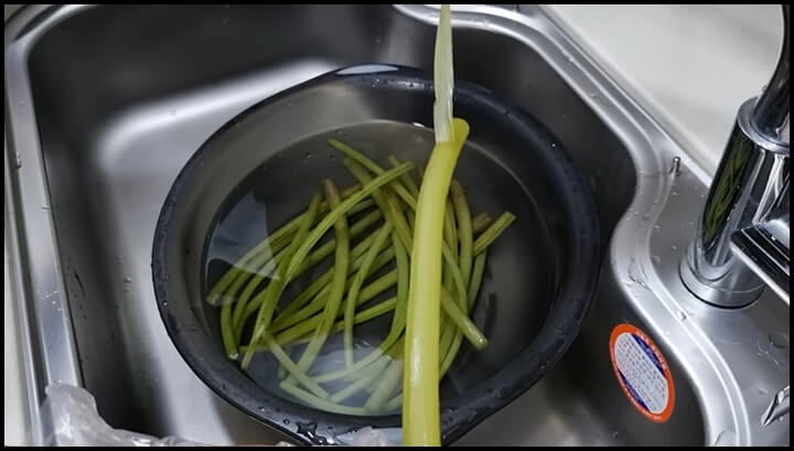 7) 껍질 벗긴 머위대는 찬물에 담가 5분 정도 기다려 줍니다/.그래야 쓴 맛이 빠져서 먹기가 좋습니다.