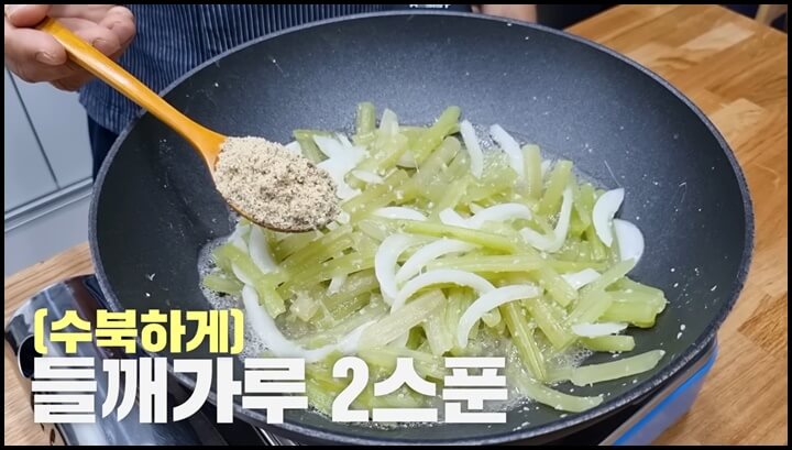 5) 3분 정도 볶은 후에 들깨가루 수북하게 두 스푼을 넣어 줍니다. 중불로 계속 볶아줍니다/