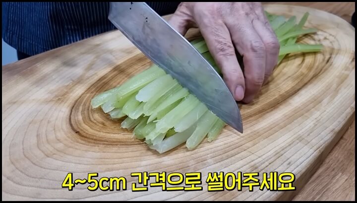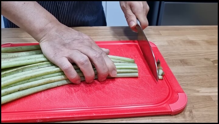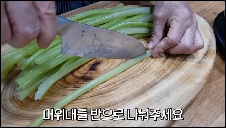 2) 반으로 가른 머위대는 4~ 5cm 간격으로 썰어 줍니다.