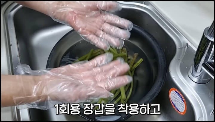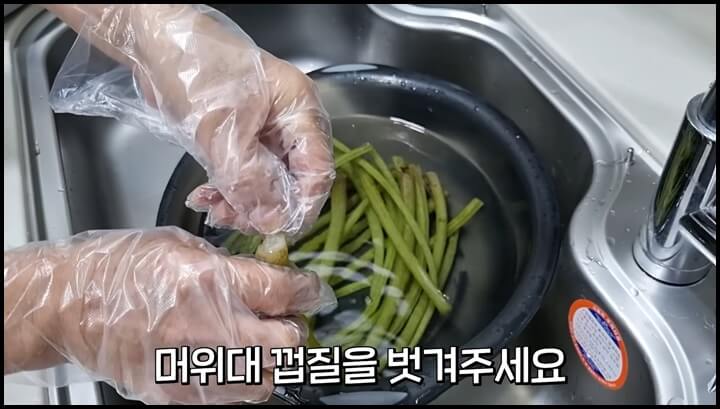 5) 찬물에 열기를 식힌 다음에 일회용 장갑을 끼고 머위대 껍질을 벗겨 줍니다. 장갑을 끼지 않으면 머위대 때문에 손톱밑이 까맣게 물들어버립니다. 그러니 장갑을 꼭 끼고 껍질을 벗기세요.