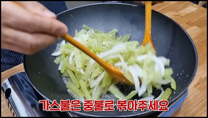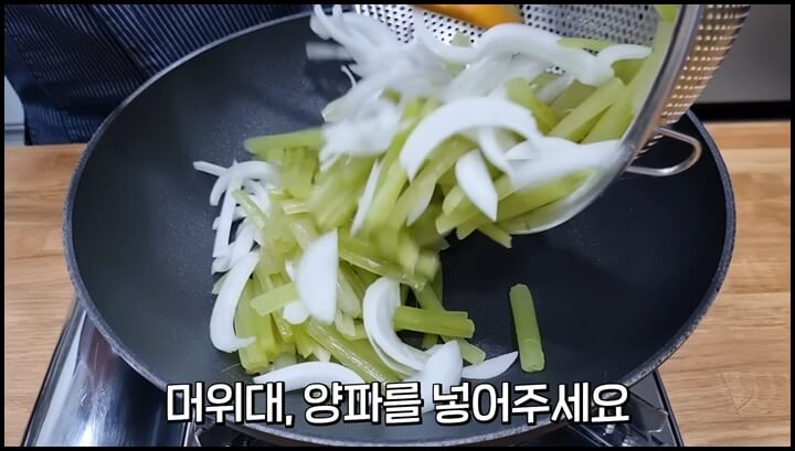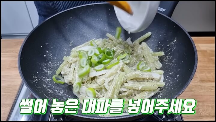 6) 볶은 다음에 불을 약불로 줄이고 썰어놓은 대파를 넣어 줍니다.