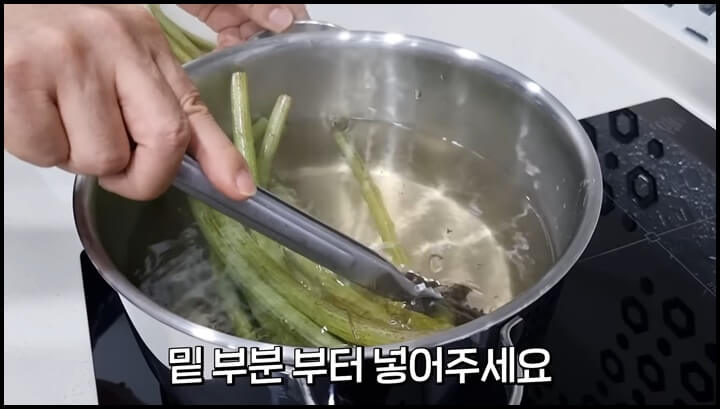 2) 머위대의 두꺼운 밑동부터 넣어 줍니다. 머위대의 가는 줄기와 익는 속도를 맞주어야 하니, 굵은 줄기를 먼저 넣고 1분 정도 데치다가 가는 줄기들을 넣어줍니다.