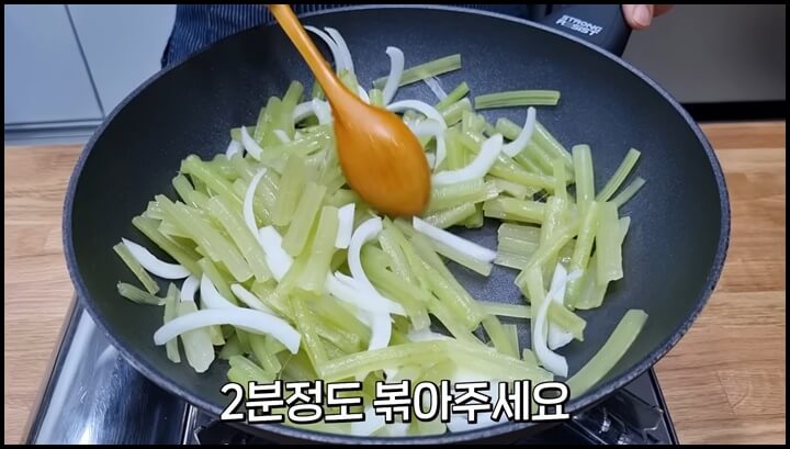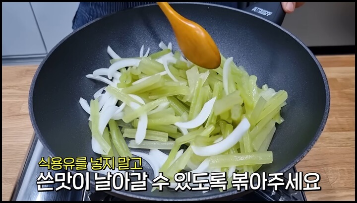1) 팬에 머위대와 양파를 넣어 줍니다. 불을켜서 그대로 볶아 주는데, 식용유를 넣지 않고 그대로 쓴 맛이 날아갈 수 있도록 볶아줍니다. 머위대가 촉촉 기 때문에 타지 않으니 그대로 2분 정도 볶아줍니다. 그래야 쓴 맛이 어느 정도 달아납니다.