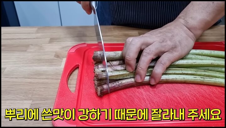 머위대 500g을 준비해서 가지런히 놓은 후 뿌리 끝 부분을 잘라줍니다. 뿌리에 쓴 맛이 강하기 때문에 1cm 안 되게 잘라내 줍니다. 이렇게 뿌리쪽을 잘라주어야 쓴 맛이 덜합니다.