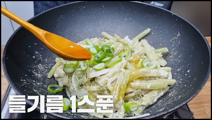 7) 마지막으로 들기름 한 스푼을 넣어 줍니다. 들기름을 넣으면 고소함이 더 올라 옵니다.