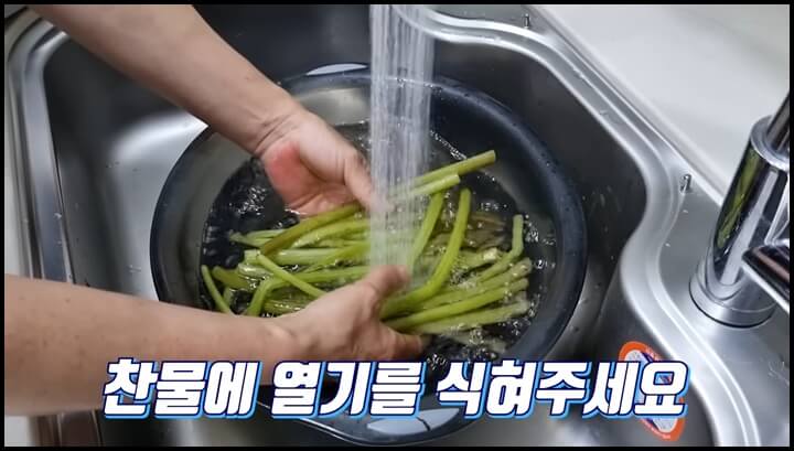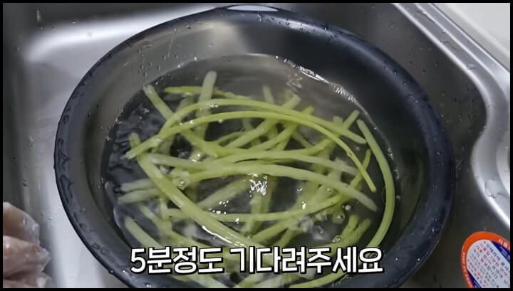 4) 7분 후에 건져서 찬물에 씻어서 열기를 식혀 줍니다.