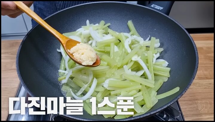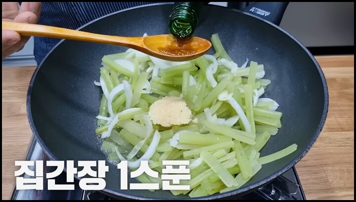 3) 다진마늘 한스푼을 넣고, 집간장 한스푼을 넣어 줍니다. 집간장이 들어가야 감칠 이 돕니다.