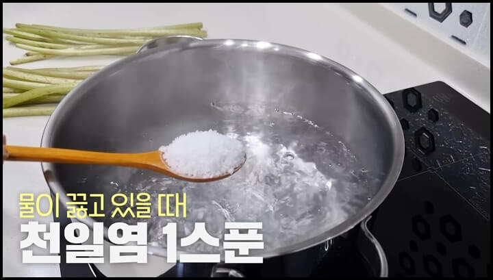 1)물이 끓고 있을 때 천일염 한 스푼을 넣고 잘 녹여 줍니다.