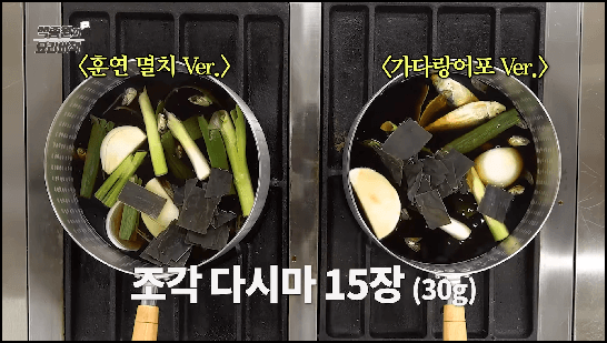 30분 정도 끓인 후에 가다랑어포를 넣고 국물을 우려낸 다음 체에 걸러서 육수만 따로 받아내면 됩니다.
