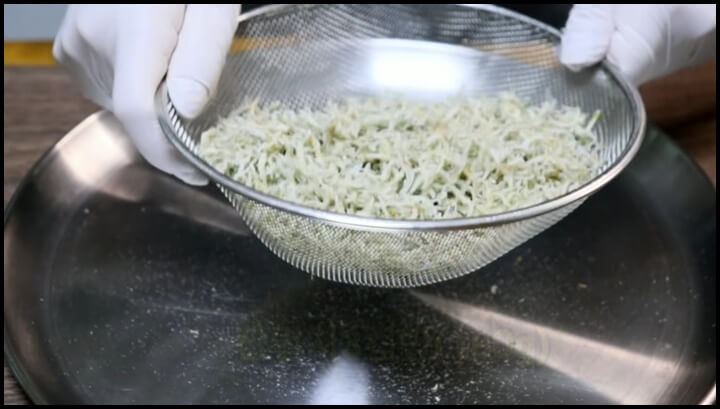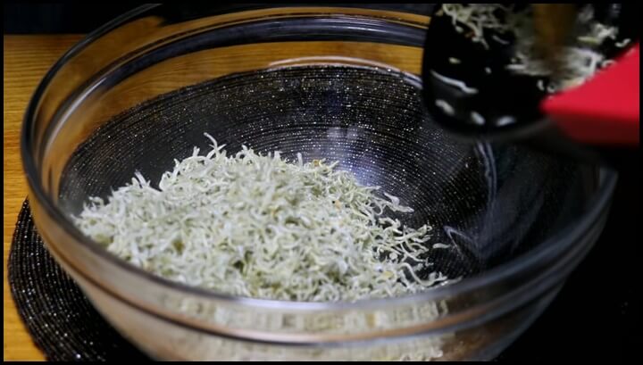 2) 멸치를 체에 넣고 잔부스러기를 털어냅니다.