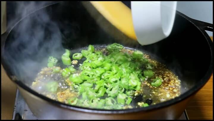 2) 양념장이 바글바글 끓어오르면, 썰어두었던 꽈리고추를 넣고 10초간 볶아줍니다.