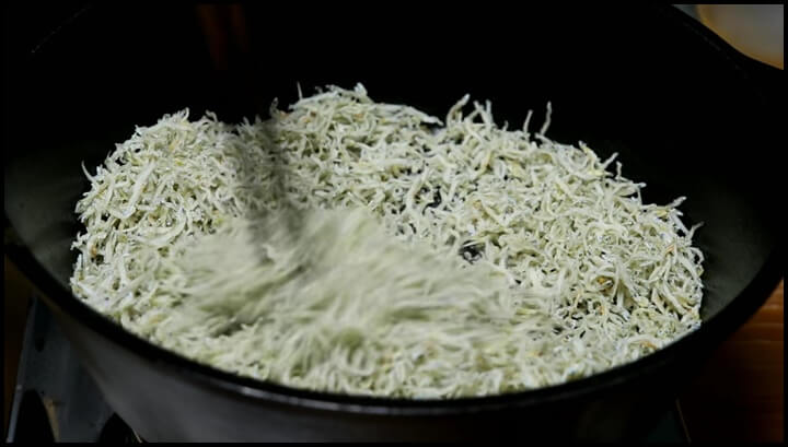 3) 중불로 달궈진 팬에 식용유 3큰술을 넣고, 멸치를 넣고 달달 볶아줍니다. 이렇게 볶아주면 멸치의 비린내를 잡아줄 수 있습니다.