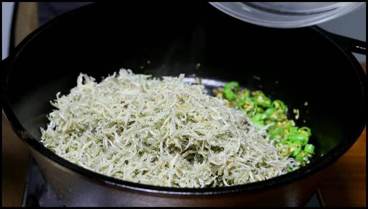 멸치에 기름 코팅이 충분히 되고, 타탁타닥 멸치 튀기는 소리가 날때 1분간 더 볶아주고 불을 끕니다.