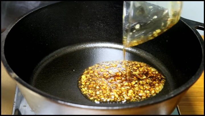 1) 멸치 볶았던 팬에 양념장을 넣고, 중불로 해서 양념장을 끓여줍니다.