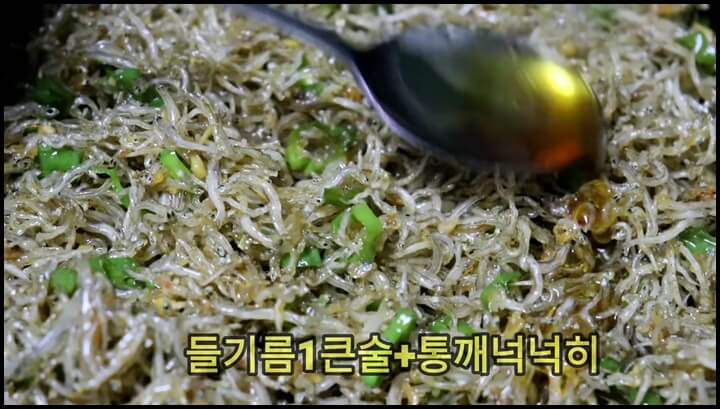 5) 마지막으로 들기름 1큰술과 통깨를 뿌려주면 멸치볶음 완성입니다.