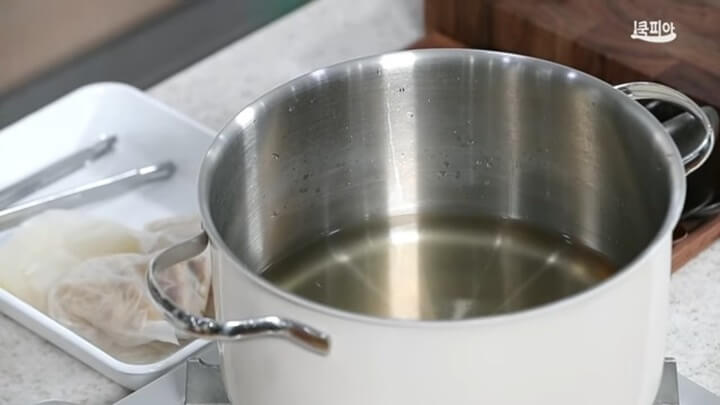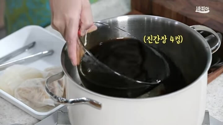 다시팩을 냄비에 넣고, 물 8컵(1.6리터)을 부어서 끓여주는데, 장물맛나니가 7컵이 나오도록 끓여줍니다. 이렇게 만들면 장물이 단맛이 우러나면서 아주 담백하고 깊은 맛이 납니다.