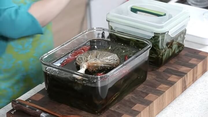 장물을 다 붓고서 위쪽의 명이나물이 다 잠기지 않을 수 있는데, 나중에 명이나물이 숨이 죽기 때문에 나중에 가라앉습니다.