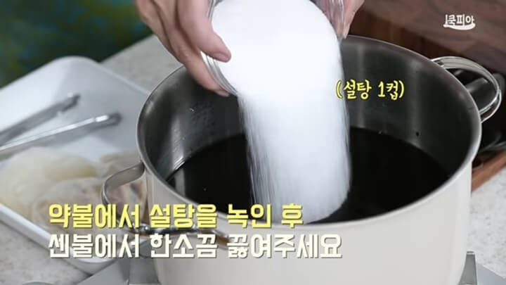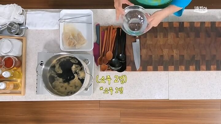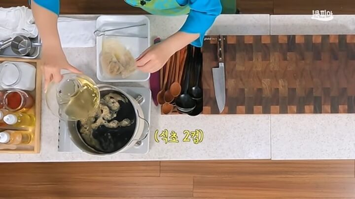 장물이 팔팔 끓으면 불을 끕니다. 그리고 여기에 소주 2컵(소주 1병)을 넣어줍니다. 여기에 식초도 2컵 넣어줍니다.