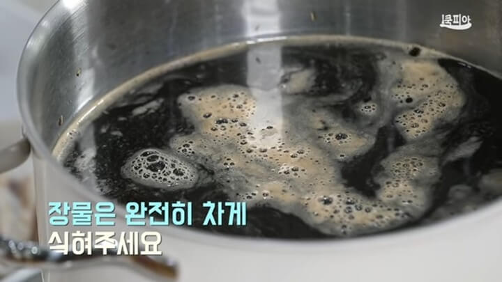 불을 끈 상태에서 넣어야 식초의 맛이 날아가지 않습니다. 이 상태에서 장물을 완전히 차게 식혀줍니다. 장물은 완전히 차게 식혀야 명이장아찌가 맛있어집니다.