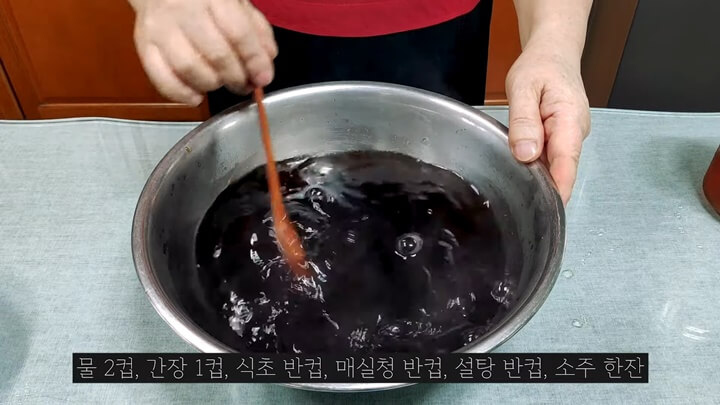 거른 육수에 식초 반컵, 매실청 반 컵, 설탕 반 컵을 넣고, 소주를 소주잔으로 한잔 넣어주세요. 소주는 방부제 역할을 해 주어서 두고 먹어도 명이나물이 물러지지 않아요.