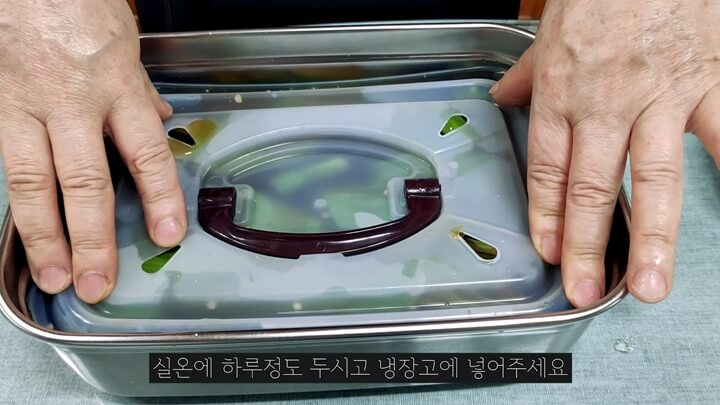 누름봉으로 꾹 눌러준 다음, 실온에서 하루 정도 둔 후에 냉장고에 넣어 보관하면 되고, 2주 정도 후에 먹으면 됩니다.