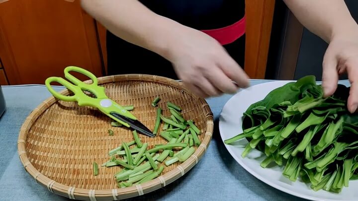 육수를 끓이는 동안 씻어서 물기를 빼 둔 명이나물을 손질해 줍니다. 줄기 끝 부분은 질기니 가위로 잘라줍니다.