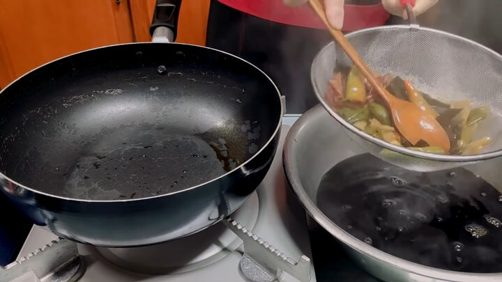 15분 정도 육수를 끓인 후 건더기를 체에 걸러주고 걸러진 야채를 숟가락으로 꾹꾹 눌러가며 채수를 짜 주고어요.